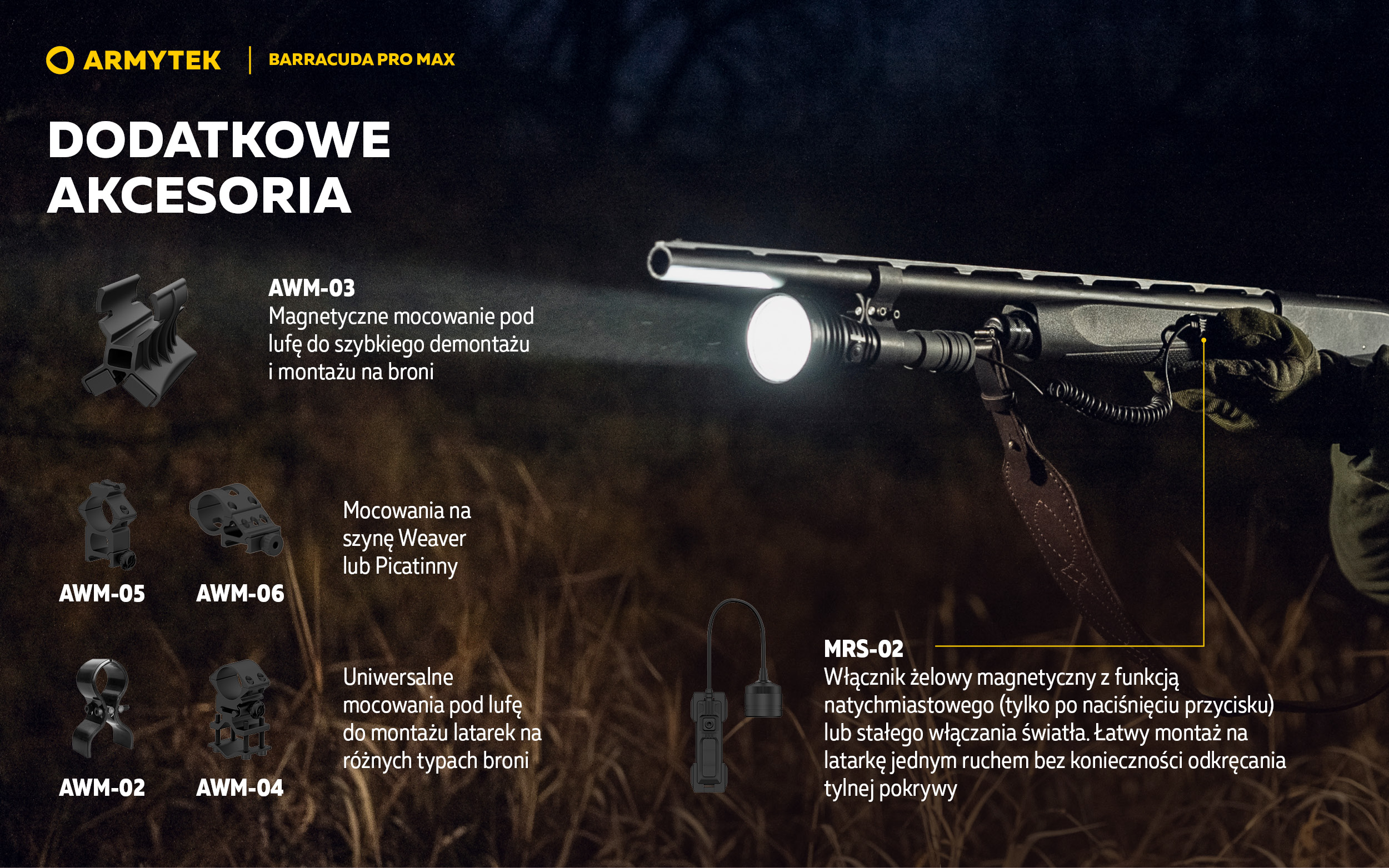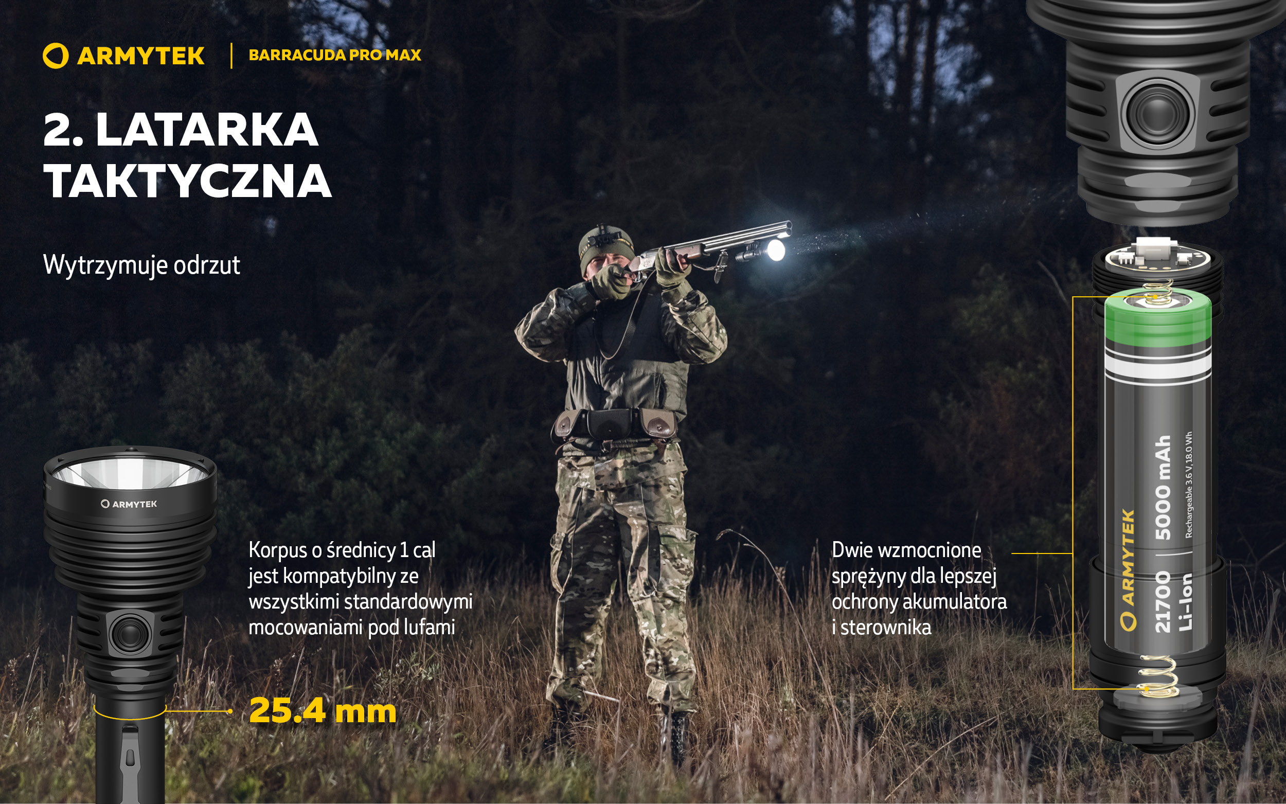 - Standardowy korpus o średnicy 1 cala i opcjonalne akcesoria do użytkowania jako latarka montowana na broń