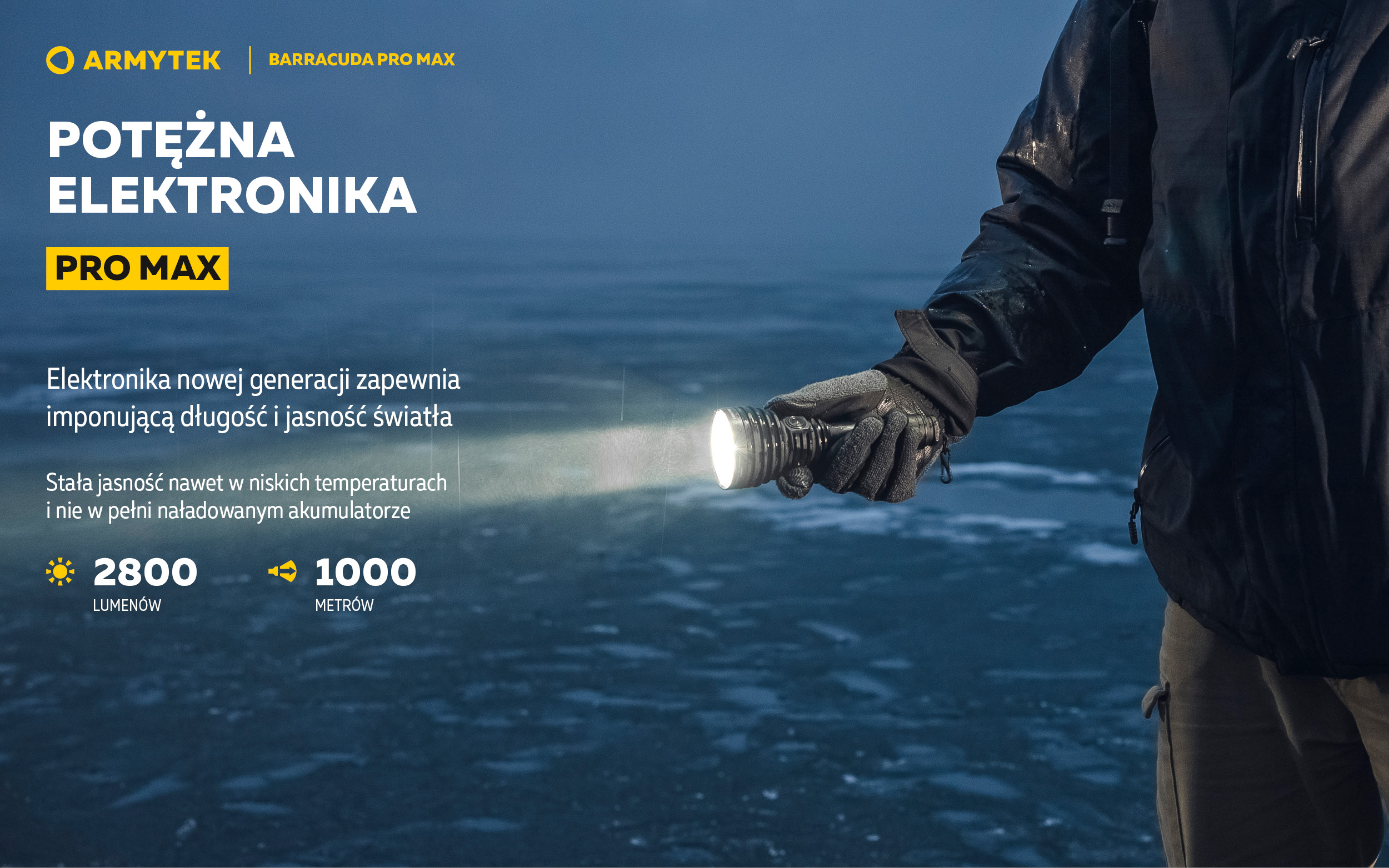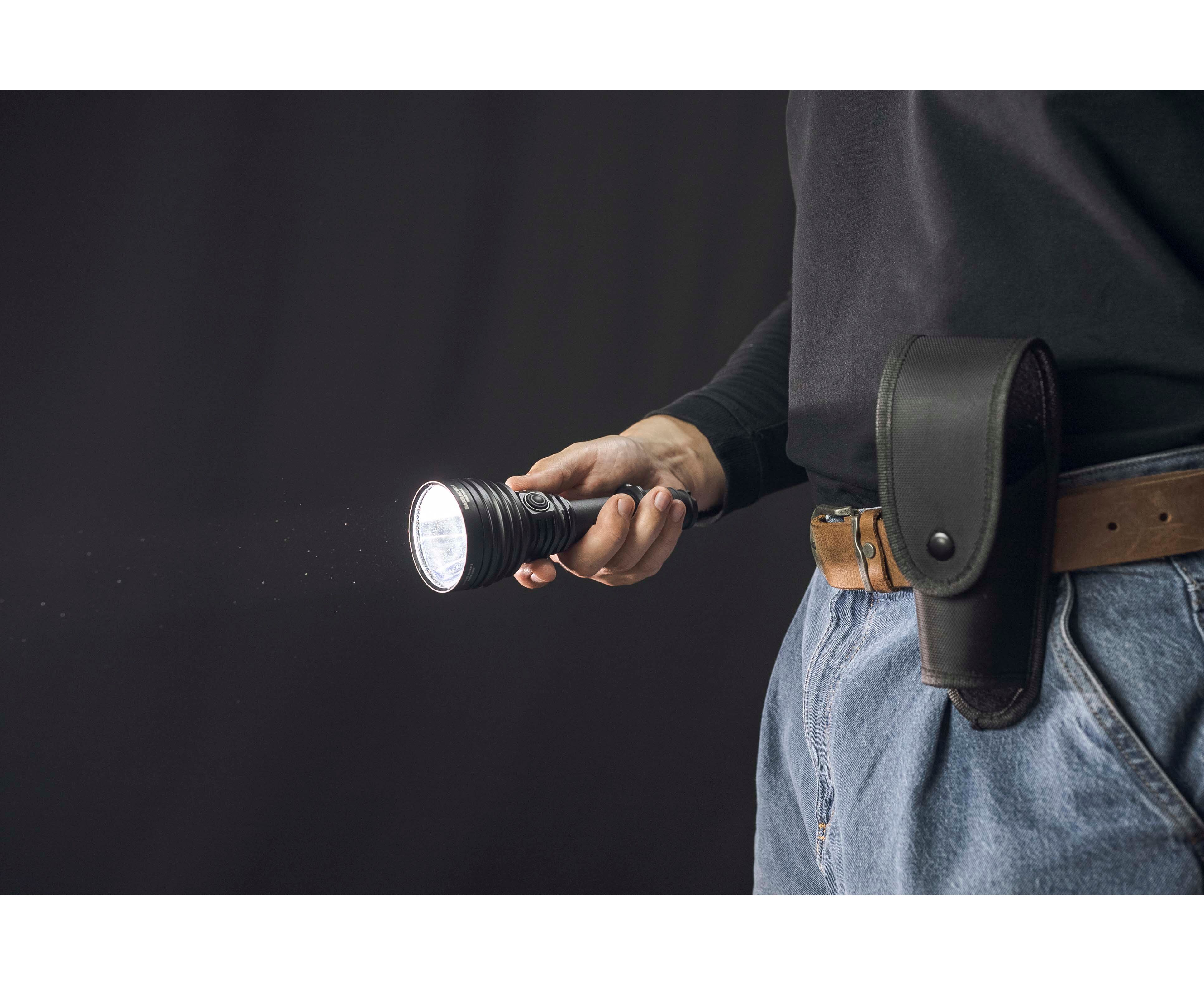 - Pro Max Elektronika nowej generacji zapewnia imponujący zasięg 1000 metrów i jasność 2800 lumenów. Stała jasność światła nawet przy niskich temperaturach i nie w pełni naładowanym akumulatorze.