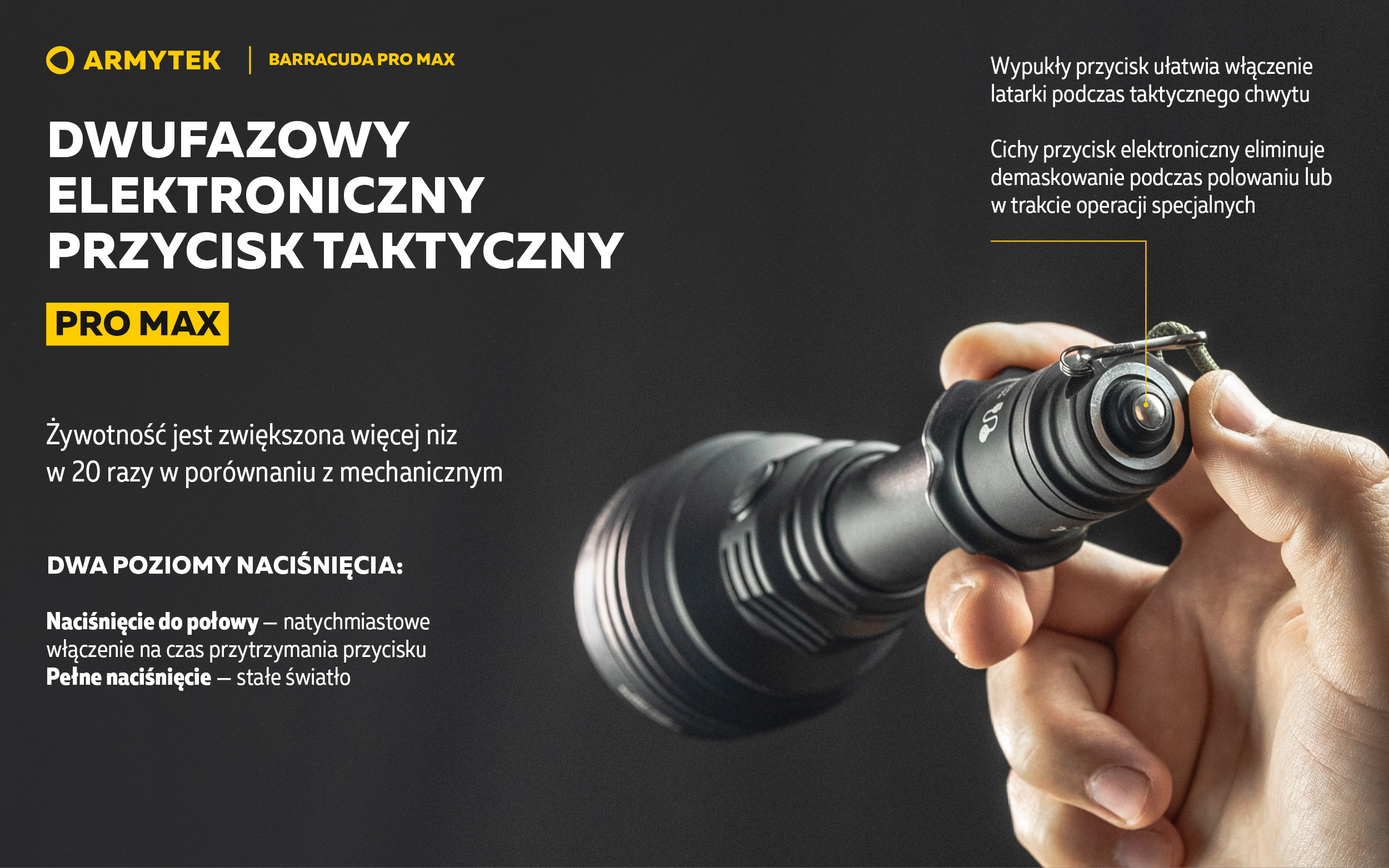 - Pro Max Dwufazowy elektroniczny taktyczny przycisk podobny do przycisku mechanicznego, ma dwa poziomy nacisku, przy czym stał się cichy, a żywotność została zwiększona ponad 20 razy.