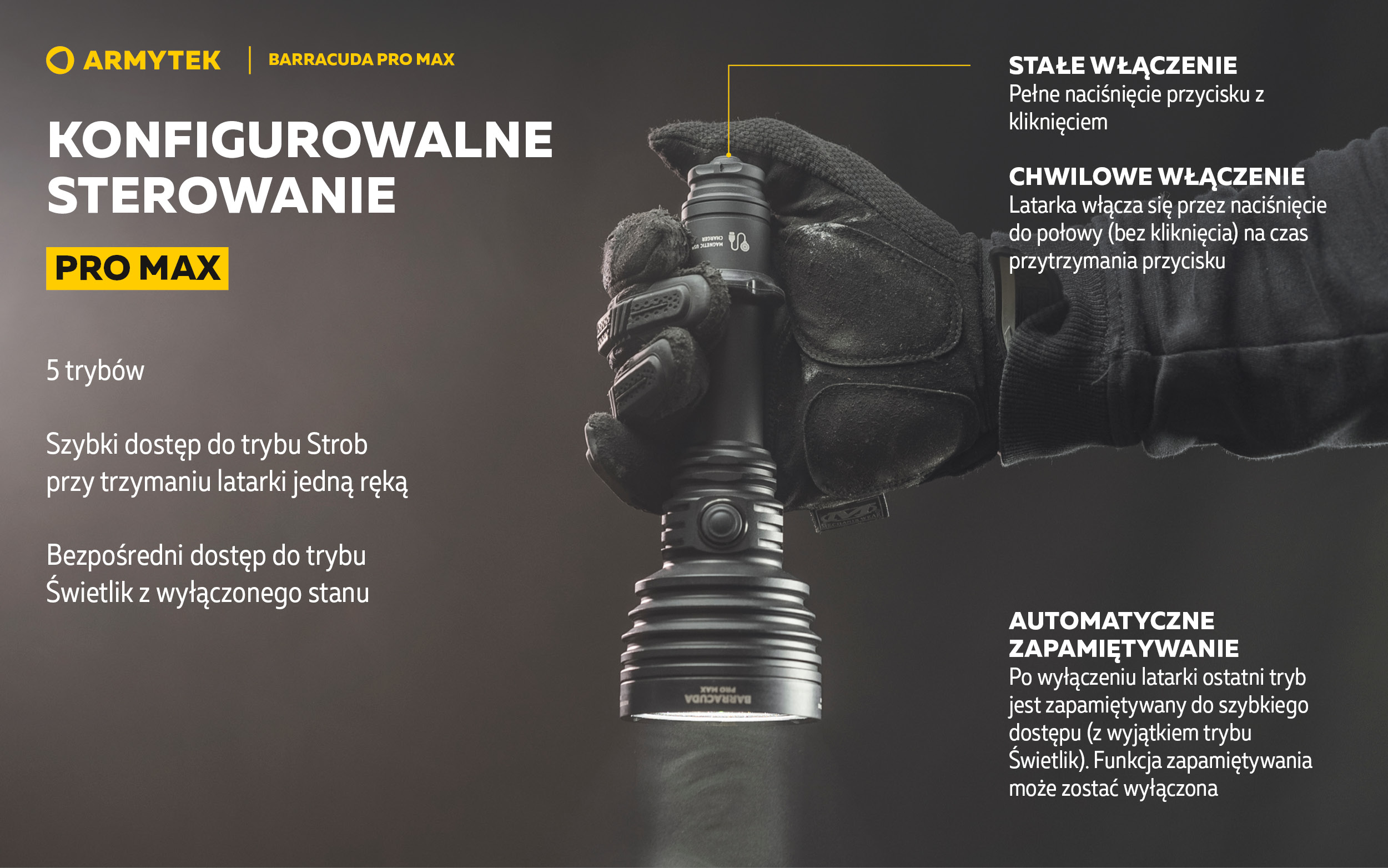 - Pro Max Konfigurowalne sterowanie dla szybkiego dostępu do potrzebnych trybów.