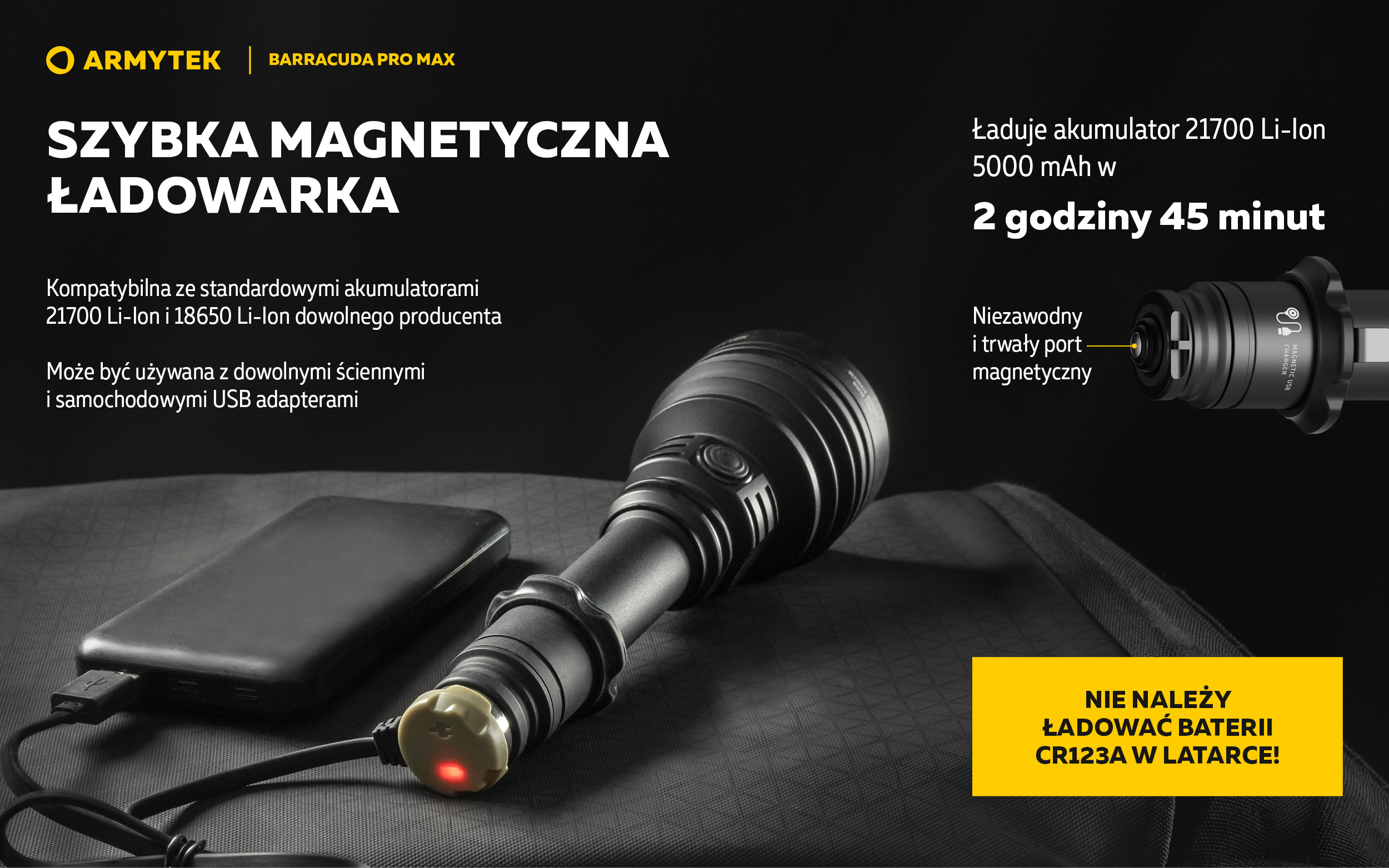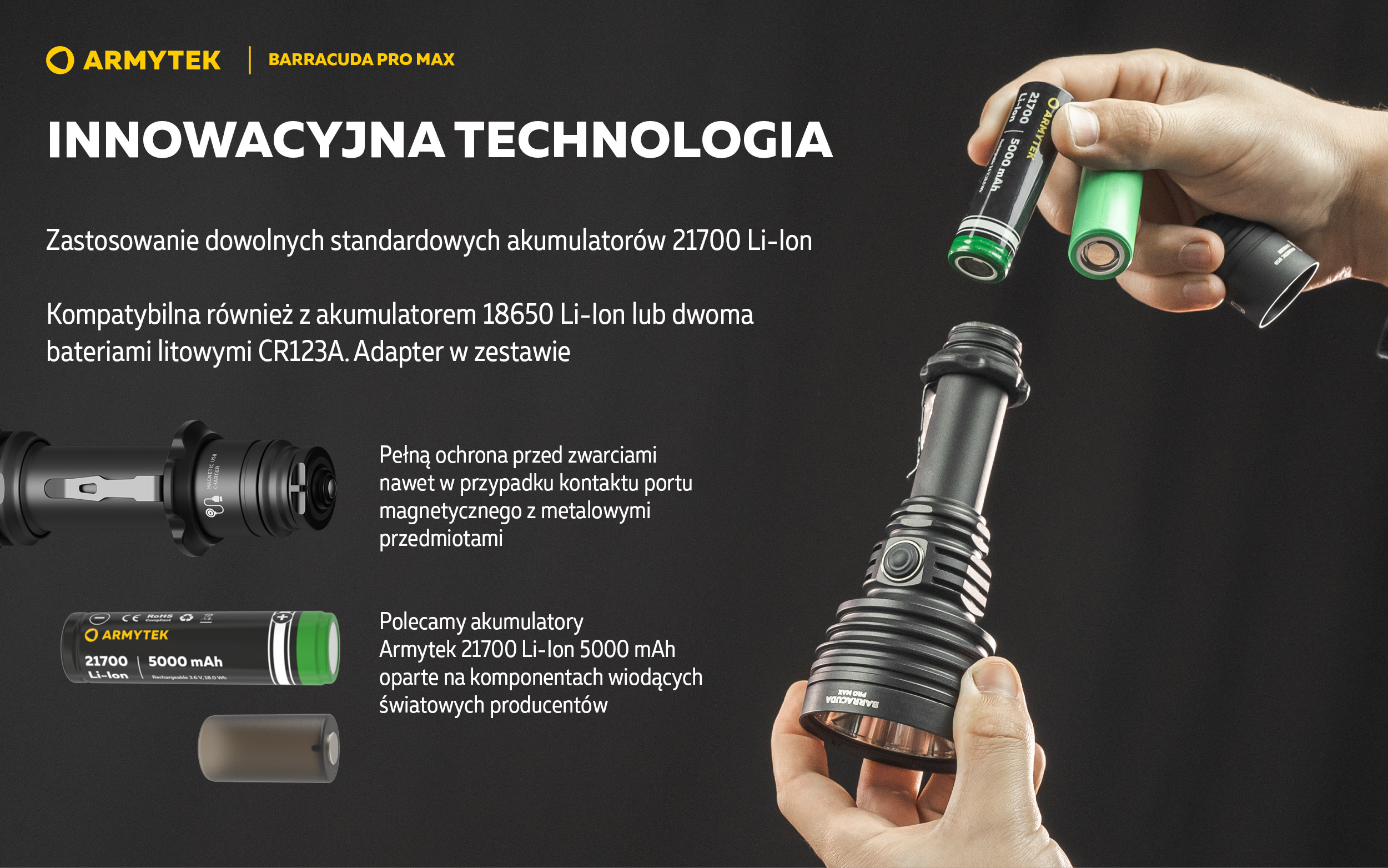 - Innowacyjna technologia pozwala na zastosowanie dowolnego standardowego akumulatora 21700 Li-Ion lub 18650 Li-Ion. Pełna ochrona przed zwarciem nawet w przypadku kontaktu portu magnetycznego z metalowymi przedmiotami.