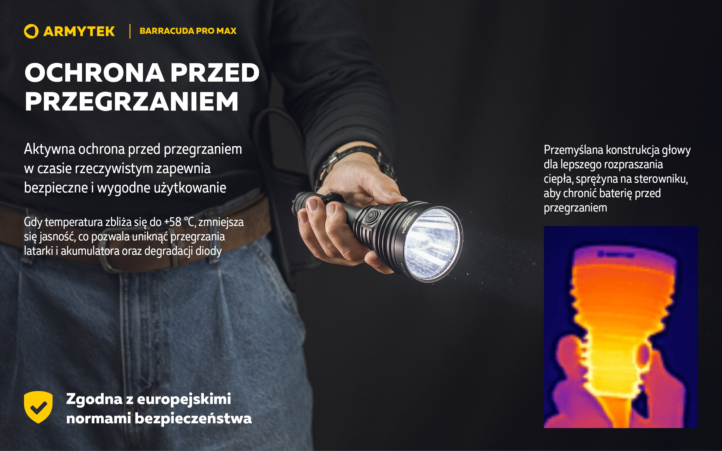 Ulepszona aktywna ochrona przed przegrzaniem w czasie rzeczywistym: zapewnia bezpieczne i wygodne użytkowanie. Gdy temperatura zbliża się do +58 °C, zmniejsza się jasność, co pozwala uniknąć przegrzania latarki i akumulatora oraz degradacji diody. Zgodna z europejskimi normami bezpieczeństwa.