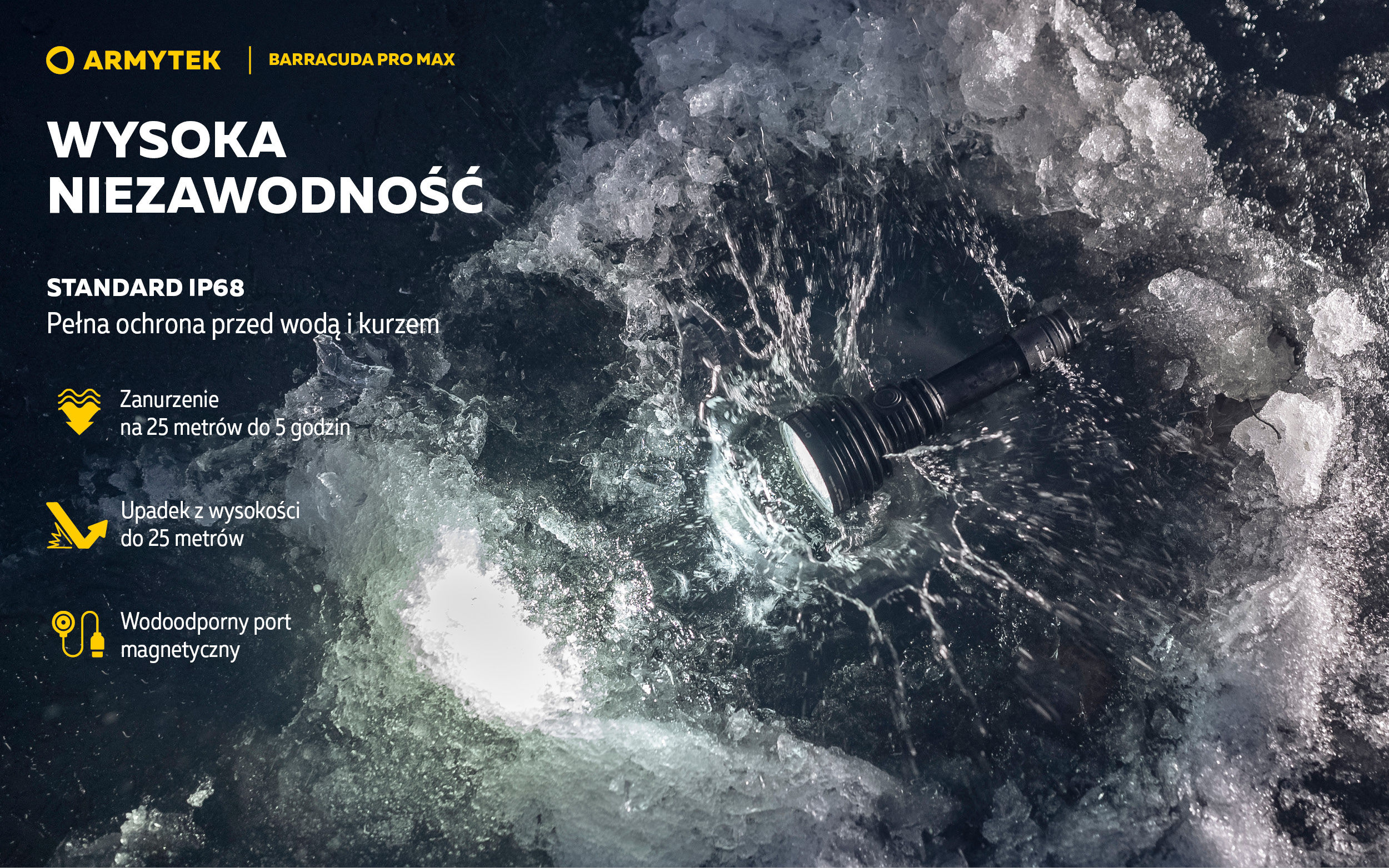 - Pełna ochrona przed wodą, brudem i kurzem zgodnie ze standardem IP68 — latarka nadal działa nawet po zanurzeniu na głębokość 25 metrów. Wytrzymuje upadki z 10 piętra.