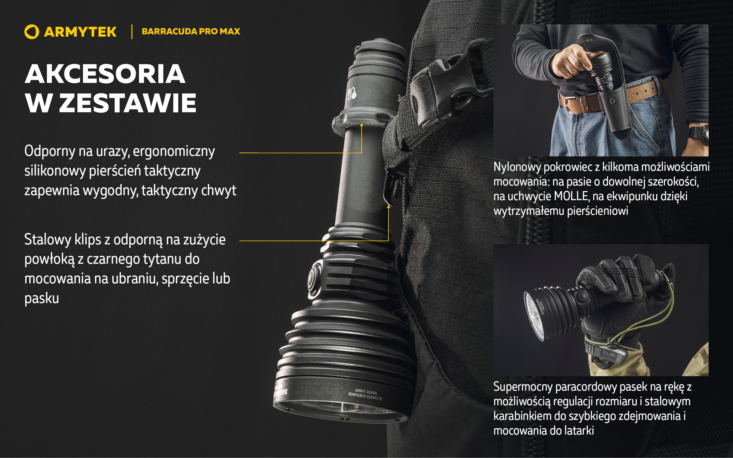 Barracuda Pro Max działa nie tylko na dołączonym akumulatorze, ale także na każdym standardowym akumulatorze 21700 Li-Ion, a dzięki adapterowi również na 18650 Li-Ion lub na dwóch bateriach litowych CR123A. Możliwość korzystania z różnych źródeł zasilania znacznie zwiększa autonomię urządzenia. Latarka jest kompatybilna z oryginalnymi włącznikami żelowymi oraz mocowaniami podlufowymi, dzięki czemu może być używana jako latarka taktyczna.